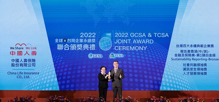 China Life received recognitions at the 2022 TSCA and GCSA awards ceremonies and won five TCSA prizes, receiving “Platinum Award for Corporate Sustainability Report awards” and “Top 100 Corporate Sustainability Awards” for the second time while winning three new prizes, “Cyber Security Leader Award,” “People Development Award,” and “Social Inclusion Award.” China Life also won the GCSA “Corporate Sustainability Report Awards – Bronze” and was the only Taiwanese insurer to win this award. The goals of China Life are to become the most recommended and trustworthy life insurer, create long-term value for all stakeholders, and fulfill social responsibilities of life insurers.