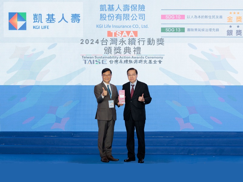 Taiwan Sustainability Action Awards was held by the TAISE, recognizing excellent action plans that implement 17 sustainable development goals (SDGs) put forward by the United Nations. Since the awards started, strategies of actions launched by KGIL for social inclusion and environmental sustainability had received recognition from the jury for two years in a row. In 2024, KGIL’s performance in achieving “SDG10 being people-centric and friendly toward new residents” and “SDG 13 pioneer of climate governance in life insurance” received “Social Inclusion-Gold” and “Environmental Sustainability-Silver”. The Company will continue to be an active player in exerting positive influence in sustainable finance through social participation and climate actions.