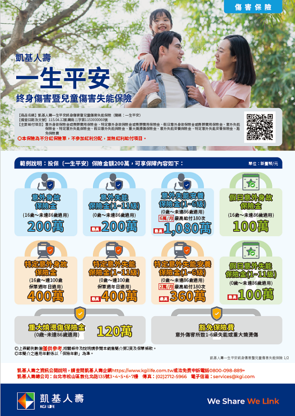 凱基人壽一生平安終身傷害暨兒童傷害失能保險(經紀代理通路專屬)