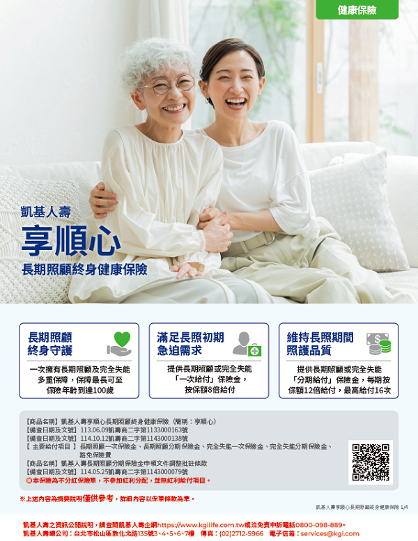 凱基人壽享順心長期照顧終身健康保險(業務通路專屬)