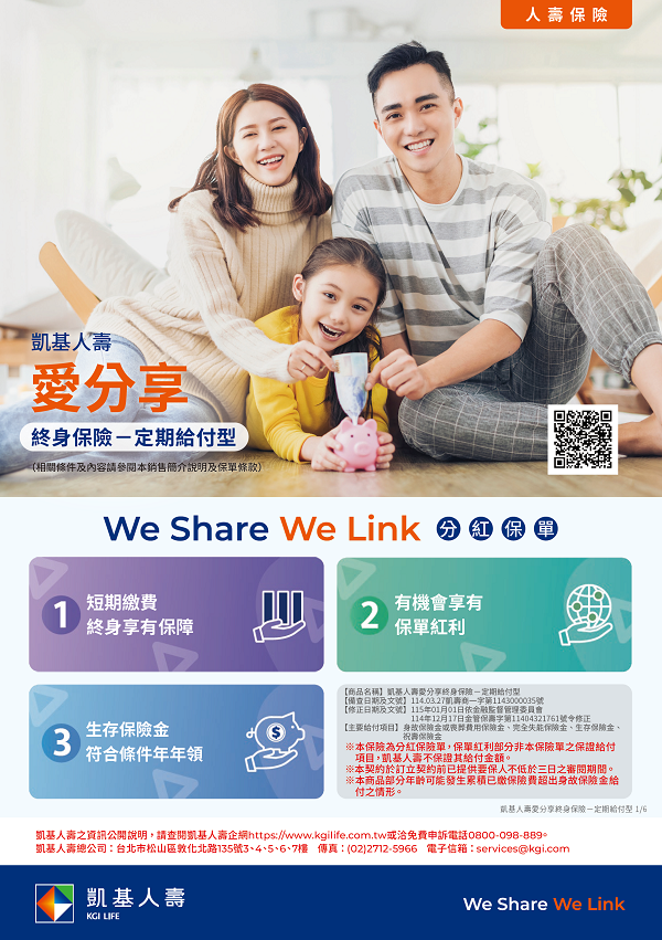 3、保險期間:終身(至被保險人保險年齡到達110歲之保單週年日止)