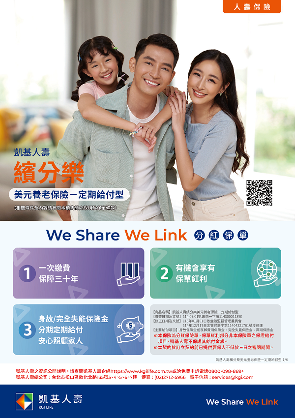 凱基人壽繽分樂美元養老保險-定期給付型