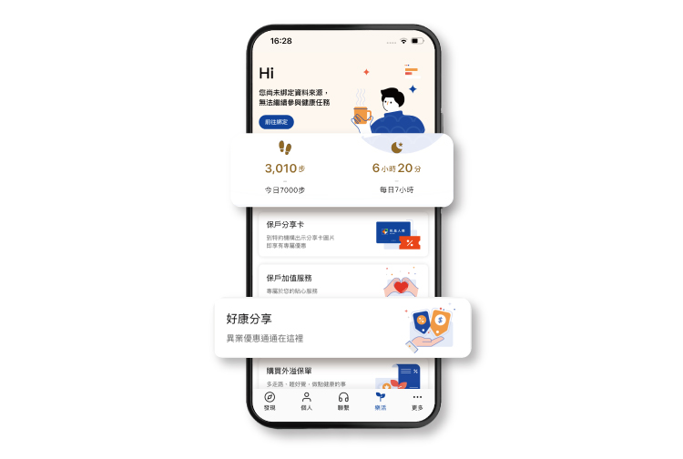 提供自主追蹤步數及睡眠紀錄,外溢保單達標狀況輕鬆。豐富多元的保戶服務及店家優惠,歡迎多加利用!